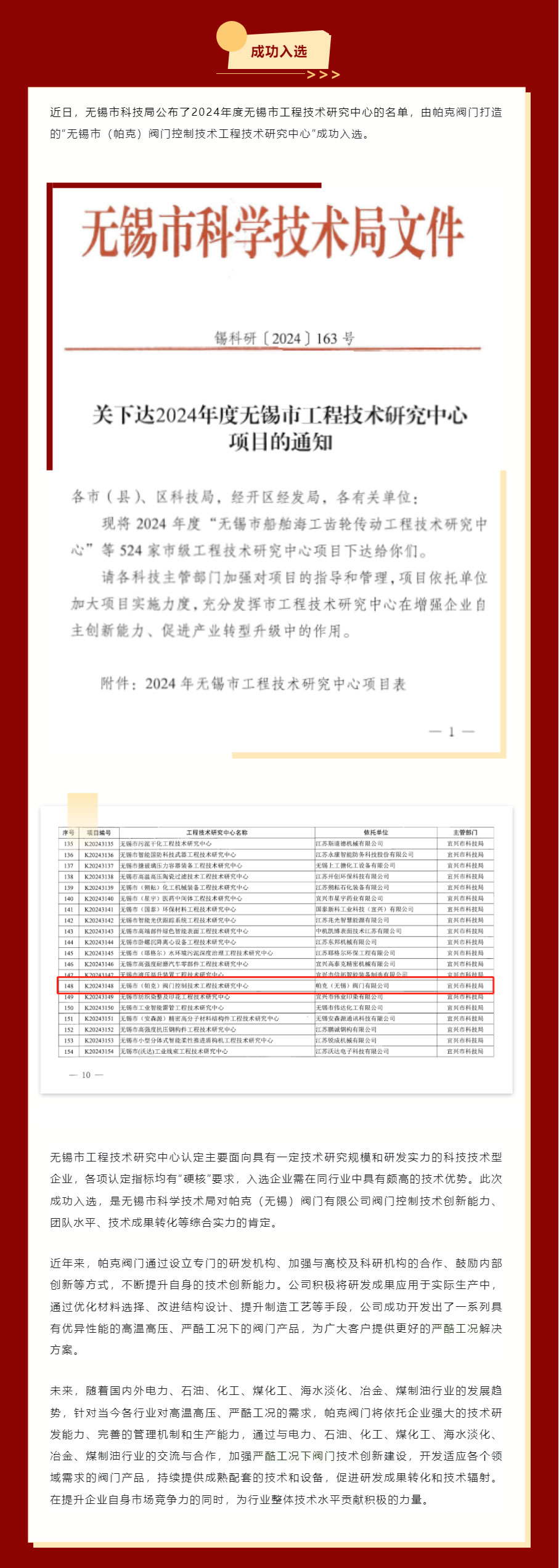 喜报!帕克阀门获批无锡市工程技术研究中心
